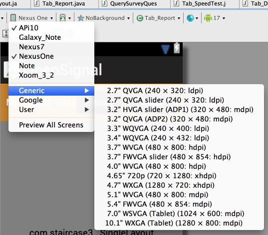 XXX // 沒有後綴,默認適用於Nexus One,Droid 2,S2 XXX-sw360dp // 比較大的手機 – Galaxy Nexus, S3, S4 XXX-sw600dp // 7" 平板 XXX-sw720dp // 10" 平板