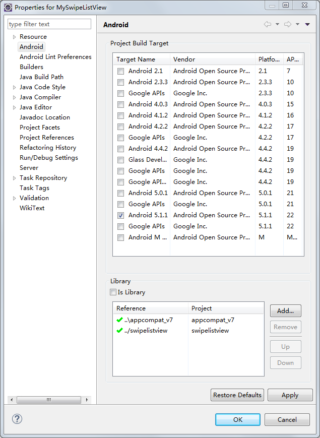 1. 下載com.fortysevendeg.swipelistview這個項目(以前GitHub上有,現在GitHub上沒有了,百度了很多次才下載到的),導入Eclipse,右鍵單擊,選擇Properties->Android,選中Library下面的IsLibrary。