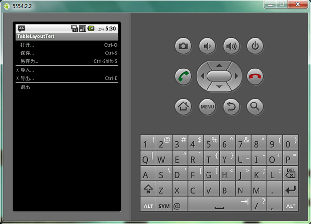 <?xml version=”1.0″ encoding=”utf-8″?> <TableLayout xmlns:android=”http://schemas.android.com/apk/res/android” android:layout_width=”fill_parent” android:layout_height=”fill_parent” android:stretchColumns=”1″> 第二列自動伸展<TableRow> <TextView android:layout_column=”1″ 我是第二列 android:text=”打開…” android:padding=”3dip” /> 元素內容與邊界之間保留3dip的距離 <TextView android:text=”Ctrl-O” android:gravity=”right” android:padding=”3dip” /> </TableRow><TableRow> <TextView android:layout_column=”1″ android:text=”保存…” android:padding=”3dip” /> <TextView android:text=”Ctrl-S” android:gravity=”right” 元素本身的內容向右對齊 android:padding=”3dip” /> </TableRow><TableRow> <TextView android:layout_column=”1″ android:text=”另存為…” android:padding=”3dip” /> <TextView android:text=”Ctrl-Shift-S” android:gravity=”right” android:padding=”3dip” /> </TableRow><View android:layout_height=”2dip” android:background=”#FF909090″ /><TableRow> <TextView android:text=”X” android:padding=”3dip” /> <TextView android:text=”導入…” android:padding=”3dip” /> </TableRow><TableRow> <TextView android:text=”X” android:padding=”3dip” /> <TextView android:text=”導出…” android:padding=”3dip” /> <TextView android:text=”Ctrl-E” android:gravity=”right” android:padding=”3dip” /> </TableRow><View android:layout_height=”2dip” android:background=”#FF909090″ /><TableRow> <TextView android:layout_column=”1″ android:text=”退出” android:padding=”3dip” /> </TableRow> </TableLayout>