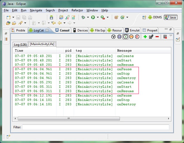 然後調出LogCat工具,來觀察程序的運行細節。通過LogCat的過濾器我們可以看到程序啟動、屏幕翻轉、按後退鍵程序退出的過程,這有助於我們驗證剛才所學的知識。