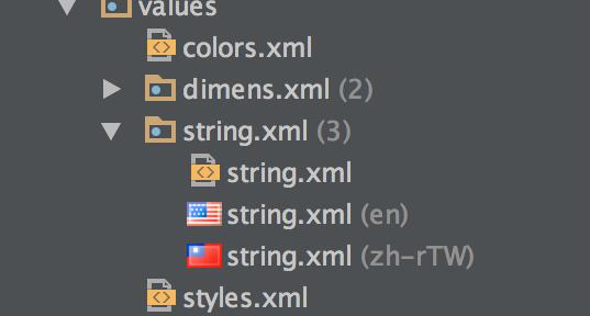 在不同的 value 文件夾下(例如 value 、value-en、values-zh-rTW 文件夾)添加不同語言的 string.xml 文件,我們的項目添加了英文、簡體中文、繁體中文三種語言,如下圖所示: