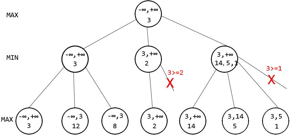 看圖中第一個紅色的叉號,該位置處會更新beta為正無窮和2的較小值,即2,導致alpha大於等於beta成立,發生剪枝,對應於min方法中相應位置處的break操作。