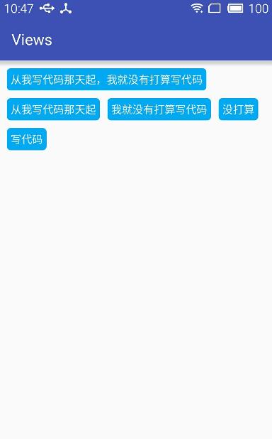 <?xml version="1.0" encoding="utf-8"?> <LinearLayout xmlns:android="http://schemas.android.com/apk/res/android" xmlns:lee="http://schemas.android.com/apk/res-auto" android:layout_width="match_parent" android:layout_height="match_parent" android:orientation="vertical"> <com.whoislcj.views.TagsLayout android:id="@+id/image_layout" android:layout_width="match_parent" android:layout_height="wrap_content" android:layout_margin="10dp" lee:tagHorizontalSpace="10dp" lee:tagVerticalSpace="10dp" /> </LinearLayout>