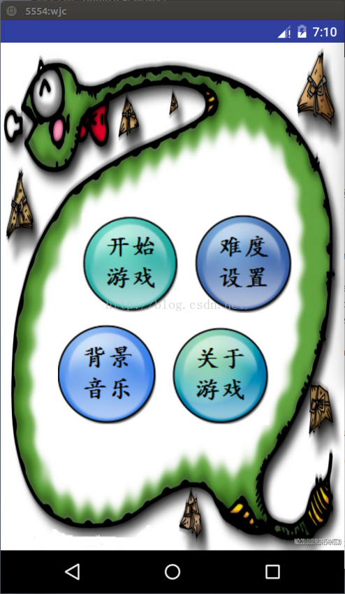 這款游戲實現的思路和源碼參考了Google自帶的Snake的例子,其中修改了一些個人認為還不夠完善的地方,加入了一些新的功能,比如屏幕上的方向操作盤,暫停按鈕,開始按鈕,退出按鈕。另外,為了稍微增加些用戶體驗,除了游戲的主界面,本人自己新增了5個界面,分別是登陸界面,菜單界面,背景音樂設置界面,難度設置界面,還有個關於游戲的介紹界面。個人覺得在新手階段,參考現成的思路和實現方式是難以避免的。重要的是我們需要有自己的理解,讀懂代碼之後,需要思考代碼背後的實現邏輯,形成自己的思維。這樣在下次開發工作時,就不用參考別人自己也能湧現出解決的思路。