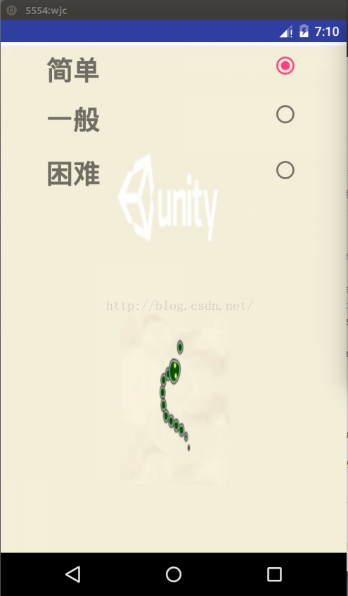 下面先講難度設置界面吧,這個和背景音樂開關其實差不多,所以以此為例,背景音樂開關界面就不啰嗦了。這裡也是用的SharedPreferences存儲數據。這裡布局文件裡把三個RadioButton放入RadioGroup,實現單選的效果。給三個按鈕設置監聽,觸發事件後分別返回對應的三個變量,這三個變量控制的是貪吃蛇運行的速度。