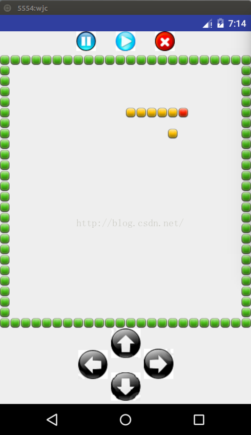 以上是自定義View的實現,實現了繪制游戲界面的主邏輯。將SnakeView作為一個UI控件插入到該界面的布局中。