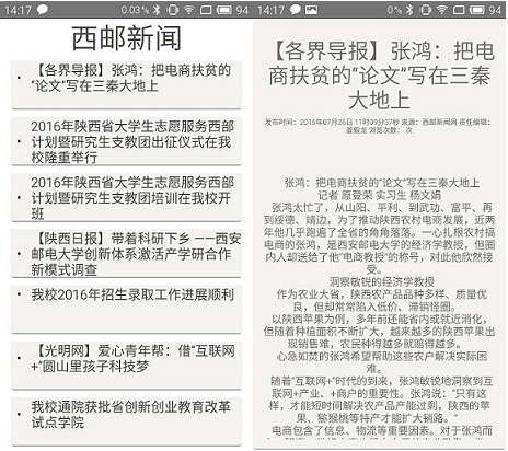 大概主頁面就是這樣 然後跳轉頁面 就是因為news裡面還放入了每一個新聞點擊之後的url所以傳到NewsActivity中再利用相同的思路去解析顯示就好了