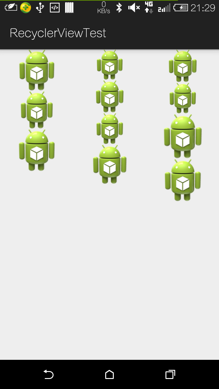 //3列 方向垂直 StaggeredGridLayoutManager mgr = new StaggeredGridLayoutManager(3, StaggeredGridLayoutManager.VERTICAL); recylcer.setLayoutManager(mgr);