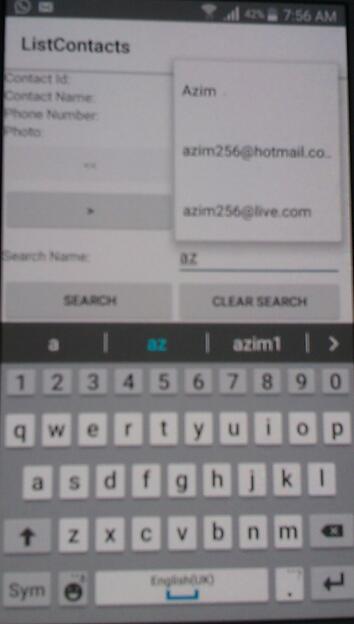 <TableLayout xmlns:android="<a href="http://schemas.android.com/apk/res/android"" rel="nofollow" target="_blank">http://schemas.android.com/apk/res/android"</a> android:layout_height="match_parent" android:layout_width="350dp"> <TableRow> <TextView android:id="@+id/txtId" android:width="175dp" android:text="Contact Id: "/> <TextView android:id="@+id/txtIdVal" android:width="175dp"/> </TableRow> <TableRow> <TextView android:id="@+id/txtDisplayName" android:width="175dp" android:text="Contact Name: "/> <TextView android:id="@+id/txtDisplayNameVal" android:width="175dp"/> </TableRow> <TableRow> <TextView android:id="@+id/txtPhoneNo" android:width="175dp" android:text="Phone Number: "/> <TextView android:id="@+id/txtPhoneNoVal" android:width="175dp"/> </TableRow> <TableRow> <TextView android:id="@+id/txtPhoto" android:width="175dp" android:text="Photo: "/> <ImageView android:id="@+id/imgPhoto" android:width="175dp"/> </TableRow> <TableRow> <Button android:id="@+id/btnFirst" android:width="175dp" android:text="<<" android:onClick="first"/> <Button android:id="@+id/btnPrevious" android:width="175dp" android:text="<" android:onClick="previous"/> </TableRow> <TableRow> <Button android:id="@+id/btnNext" android:width="175dp" android:text=">" android:onClick="next"/> <Button android:id="@+id/btnLast" android:width="175dp" android:text=">>" android:onClick="last"/> </TableRow> <TableRow> <TextView android:id="@+id/txtSearch" android:width="175dp" android:text="Search Name: "/> <AutoCompleteTextView android:id="@+id/txtSearchVal" android:width="175dp"/> </TableRow> <TableRow> <Button android:id="@+id/btnSearch" android:width="175dp" android:text="Search" android:onClick="search"/> <Button android:id="@+id/btnClearSearch" android:width="175dp" android:text="Clear Search" android:onClick="clearSearch"/> </TableRow> </TableLayout>