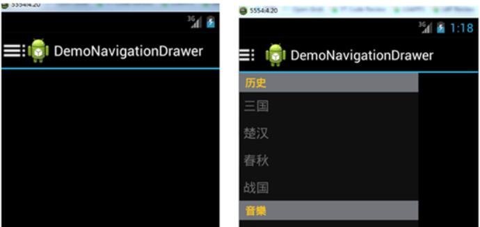 在點擊側邊菜單選項的時候我們往往需要隱藏菜單來顯示整個菜單對應的內容。ActionBarDrawerToggle就是其中一種方法。