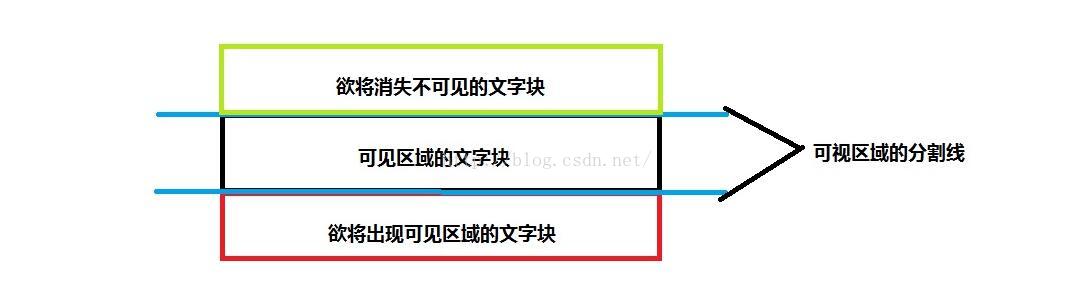 1、首先我們將控件分為三個區塊,上面綠色部分為消失不可見的塊,中間黑色部分為可見區域,下面紅色部分為欲出現不可見區域。藍色的線代表的是整個控件的上線和下線。