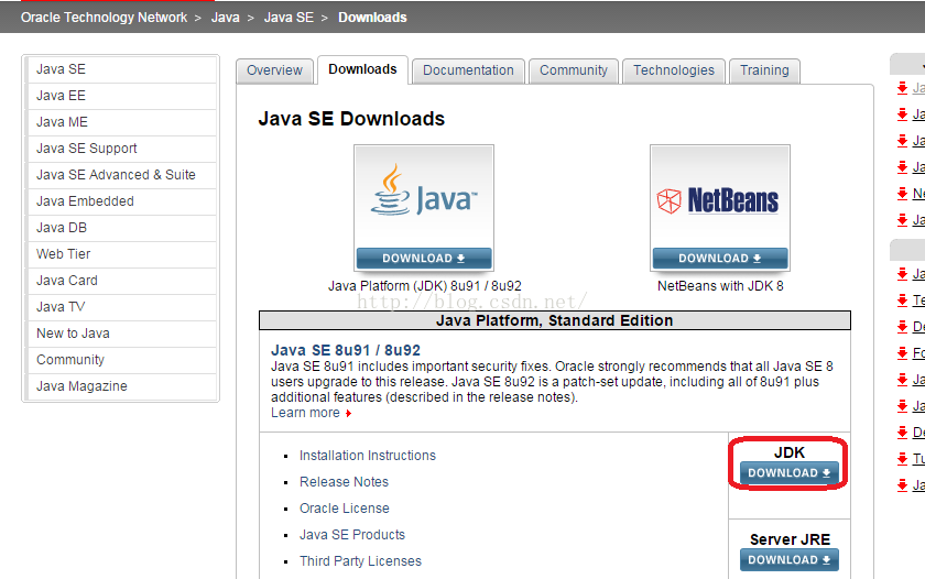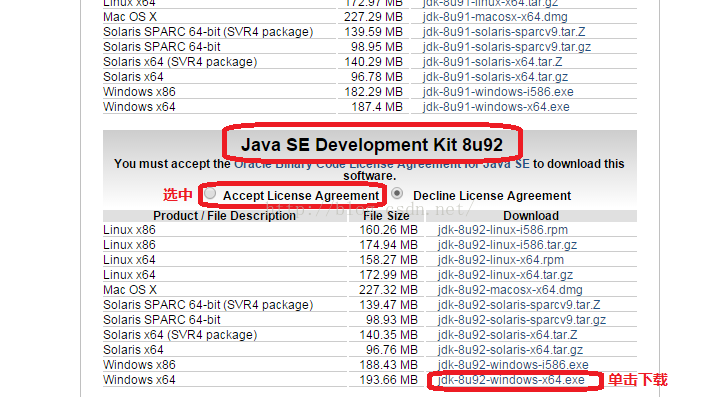 如下,選擇最新的版本JDK 8u92,選中接受協議許可後,根據自己電腦的系統選擇合適的版本下載: