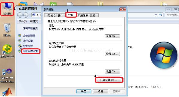 在桌面上,右擊計算機 ---》 屬性---》 高級環境設置---》 高級---》 環境變量,操作演示如下