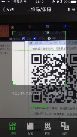 2. 二維碼有容錯率,容錯率越大,生成的二維碼也就越復雜,但是越不容易出錯,並且,當二維碼被遮擋的時候也越容易掃描出來。這裡我上傳的二維碼容錯為30%,可以從左上角開始掃描,大概掃描到下圖范圍的時候就可以識別出來了: