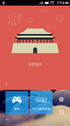 正如你看到的圖片內容,今天是國慶節,在這裡祝大家節日快樂!所以你每次打開的時候圖片可能不一樣。這個效果看起來有點像Android裡面講的TranslateAnimation動畫,我覺得用Animation動畫應該很難實現出這種效果(當然有用animation實現zaker這種效果的大牛可以與我們分享下)。QQ裡也有這麼個功能的界面,只不過QQ的是展示一張圖片兩到三秒後再進入主界面。