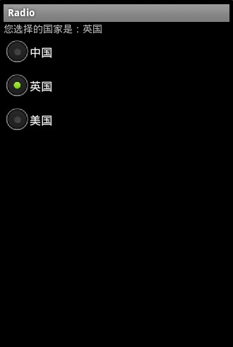 myTextView.setText("您選擇的國家是:" + ukBtn.getText().toString());