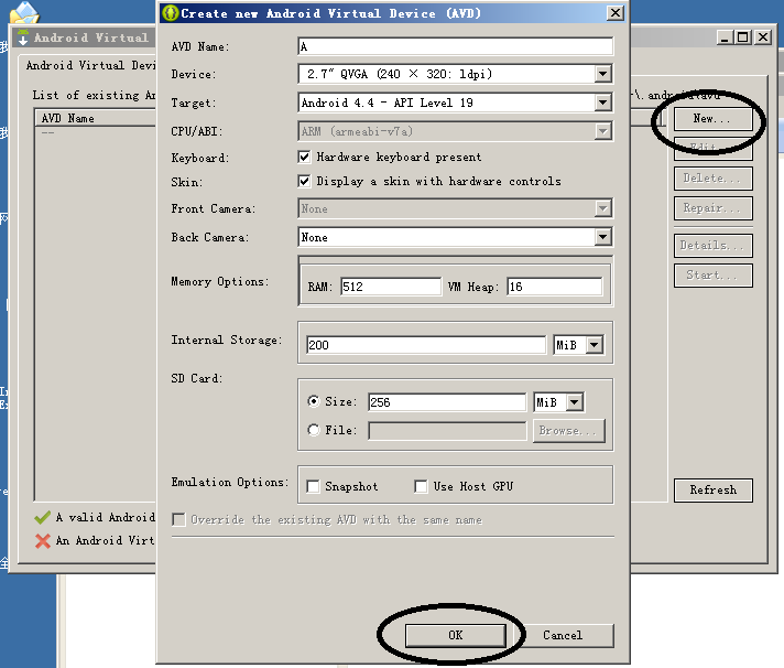 6、之後選擇new,新建一台機器,選項基本沒得選,默認即可,AVD name隨便,這裡是A。Device選個配置最爛的手機。畢竟為了調試的時候不卡。最後補個SD card大小,256M足矣。點擊“確定”。以後你的安卓程序就運行在這台“手機”上。