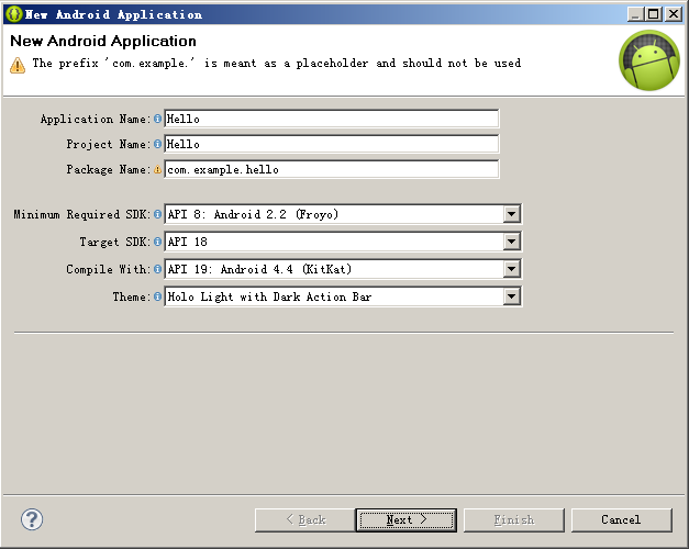 8、在Application輸入工程的名字之後,其余系統會給你補填,這裡是Hello。其余默認即可。一直點下一步下一步,點Finish的時候可能卡得比較久,請耐心等待。
