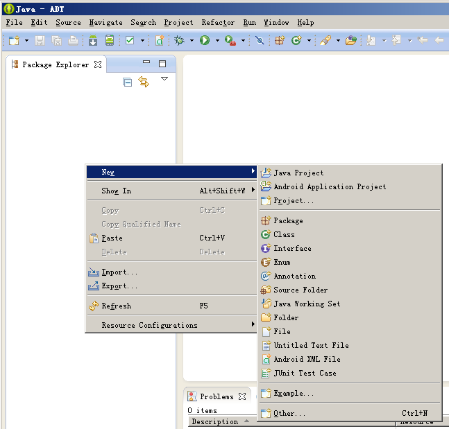 7、之後在工程區,New->Android Application Project新建一個安卓工程。