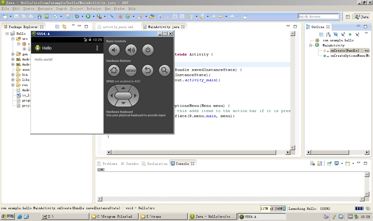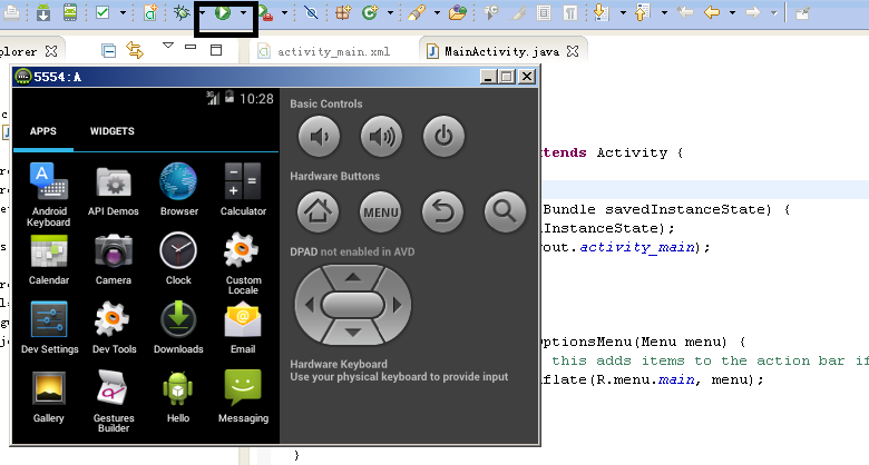 12、等待了幾乎15分鐘之後,Android的第一個程序Helloworld就弄出來了。