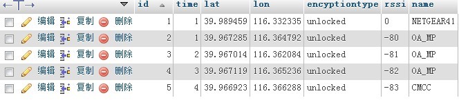$result = mysql_query("INSERT INTO wifi_state(time, lat, lon,encyptiontype,rssi,name) VALUES('$time', '$lat', '$lon','$encyptiontype','$rssi','$name')");