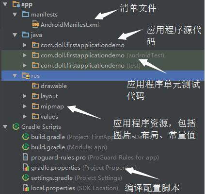 資源相當於我們在程序運行之前定義好的數據,也是應用程序的重要組成部分,為此Android Studio專門使用一個文件夾來管理應用程序中使用的資源,其具體目錄結構如下: