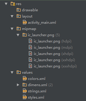 mipmap:圖片資源,從上圖可以看到,分為hdpi(高分辨率)、mdpi(中等分辨率)、xhdpi/xxhdpi/xxxhdpi(超高分辨率…………)的資源,Android框架會根據手機的分辨率自動選擇合適的圖片用於繪制。