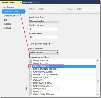 下圖是在VS2015中設置Read_Contacts和Read_Profile的辦法(通過單擊主菜單【項目】下的【屬性】彈出此界面):
