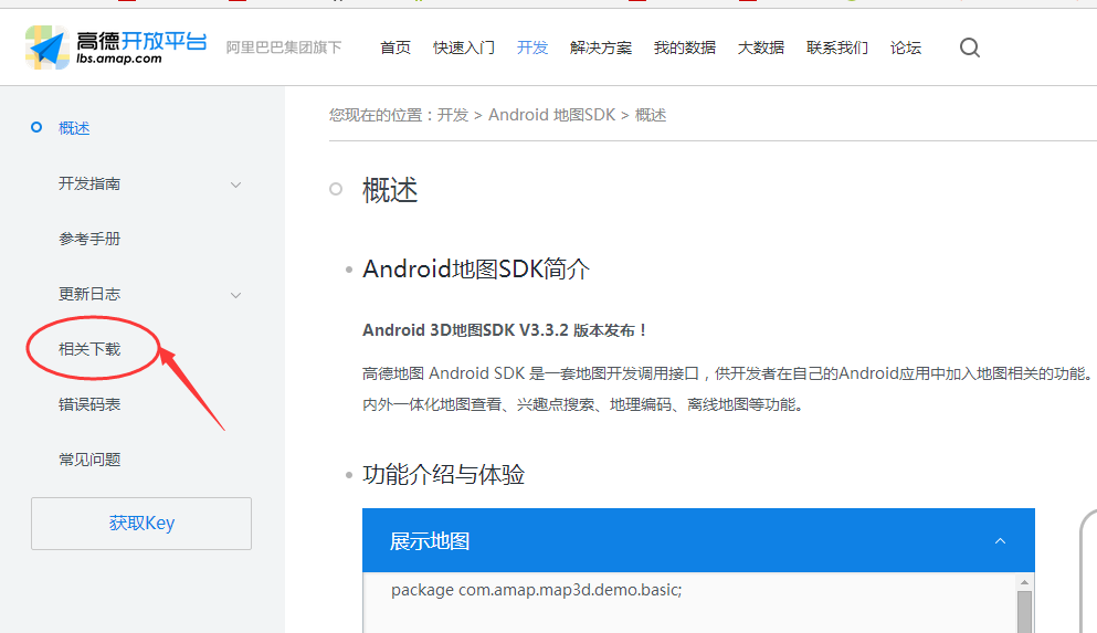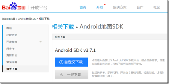 打開網頁後,選擇【開發】à【Andoid開發】下的第1項“Android地圖SDK”,單擊該網頁中的【相關下載】,就會出現下面的界面: