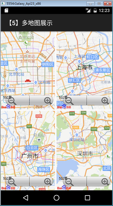 <?xml version="1.0" encoding="utf-8"?> <LinearLayout xmlns:android="http://schemas.android.com/apk/res/android" xmlns:map="http://schemas.android.com/apk/res-auto" android:layout_width="match_parent" android:layout_height="match_parent" android:orientation="vertical" > <LinearLayout android:layout_width="match_parent" android:layout_height="match_parent" android:layout_marginBottom="5dp" android:layout_weight="1" android:orientation="horizontal" > <fragment android:id="@+id/map1" android:layout_width="match_parent" android:layout_height="match_parent" android:layout_marginRight="5dp" android:layout_weight="1" class="com.baidu.mapapi.map.TextureMapFragment" /> <fragment android:id="@+id/map2" android:layout_width="match_parent" android:layout_height="match_parent" android:layout_weight="1" class="com.baidu.mapapi.map.TextureMapFragment" /> </LinearLayout> <LinearLayout android:layout_width="match_parent" android:layout_height="match_parent" android:layout_weight="1" android:orientation="horizontal" > <fragment android:id="@+id/map3" android:layout_width="match_parent" android:layout_height="match_parent" android:layout_marginRight="5dp" android:layout_weight="1" class="com.baidu.mapapi.map.TextureMapFragment" /> <fragment android:id="@+id/map4" android:layout_width="match_parent" android:layout_height="match_parent" android:layout_weight="1" class="com.baidu.mapapi.map.TextureMapFragment" /> </LinearLayout> </LinearLayout>