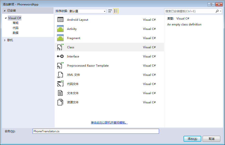 (1)鼠標右擊項目名à添加類,在彈出的窗口中,選擇【Class】模板,名稱:PhoneTranslator.cs,如下圖所示,單擊【添加】按鈕。