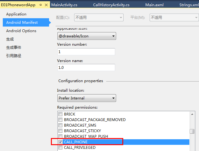 注意:運行前需要先勾選【CALL PHONE】設置允許撥號權限,否則運行會出現異常: