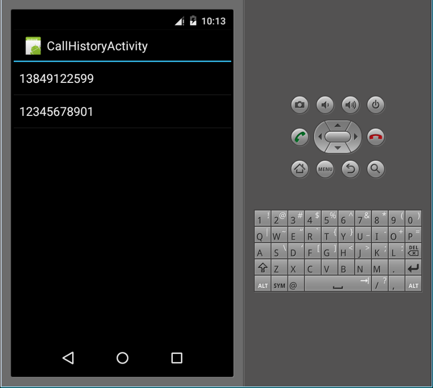 (7)運行,再撥一個號(例如12345678901),然後查看撥號記錄。下圖是用另一種模擬器查看的運行效果(你可以創建多種不同的模擬器,分別觀察同一個項目的運行效果):