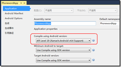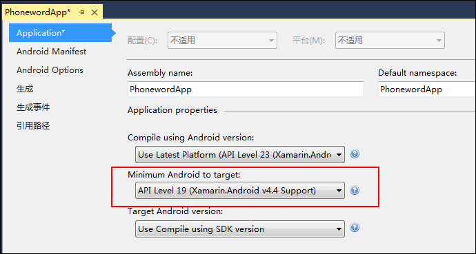 將“Target framework”更改為某個API版本,即可擁有該版本的所有API功能。如果希望兼容早期的Android版本,可修改“Minimum Android to target”選項:
