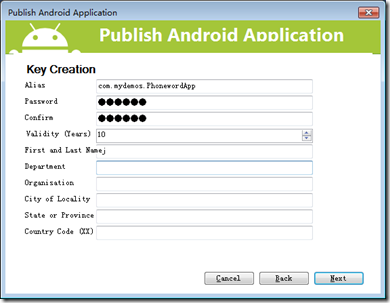 在彈出的發布窗口中,選擇【Create New KeyStore】,輸入【Password】,單擊【Next】,然後輸入別名(Alias)、口令(Password)、你編寫的程序有效年數(Validity years)、你的姓名(First and Last Name)等信息: