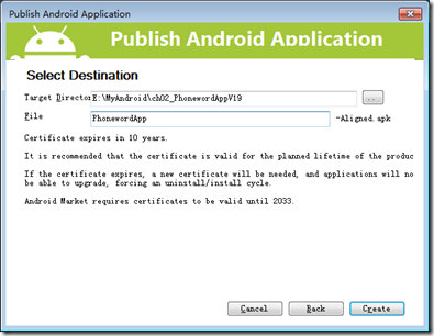 單擊【Next】,輸入發布的目標文件夾,應用程序文件名,然後單擊【Create】,它就會自動在目標文件夾下創建PhonewordApp-Aligened.apk文件。