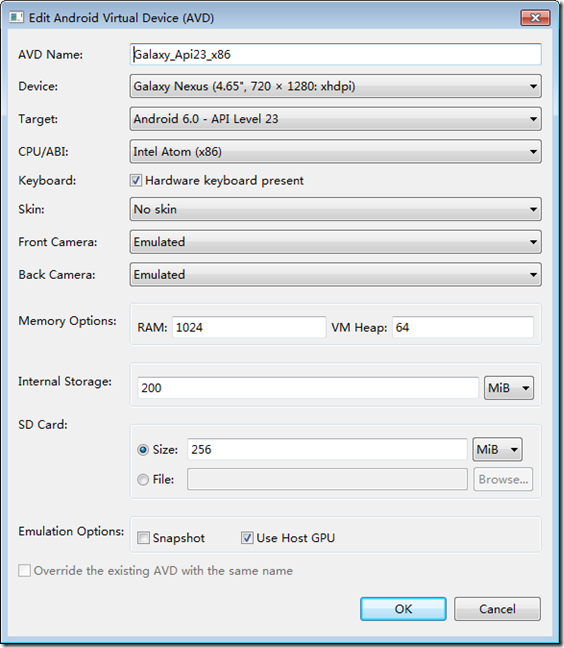 例如,Galaxy_Api23_x86模擬器的配置如下: