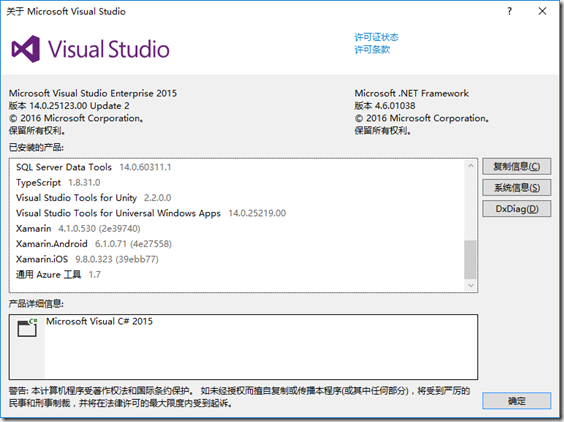 下面是安裝Xamarin for VS 4.1.0.530後,運行VS2015的【幫助】->【關於Microsoft Visual Studio…】看到的界面截圖: