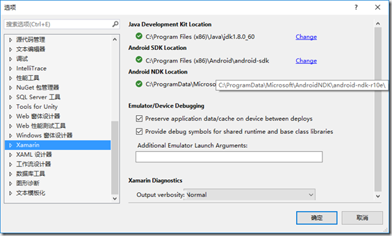 安裝後,運行VS2015,【工具】->【選項】->【Xamarin】,修改配置: