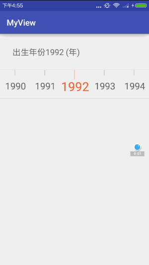 <TextView android:id="@+id/year_txt" android:layout_width="wrap_content" android:layout_height="wrap_content" android:layout_margin="30dp" android:text="出生年份 (年)" android:textSize="20dp" /> <com.example.tangyangkai.myview.MyScrollView android:id="@+id/scroll_view" android:layout_width="match_parent" android:layout_height="70dp" myscroll:lineColor="@color/font_text" myscroll:titleColor="@color/strong" myscroll:titleSize="30dp"> </com.example.tangyangkai.myview.MyScrollView>