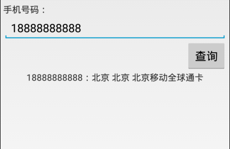 <?xml version="1.0" encoding="utf-8"?> <LinearLayout xmlns:android="http://schemas.android.com/apk/res/android" android:orientation="vertical" android:layout_width="fill_parent" android:layout_height="fill_parent" android:paddingTop="5dip" android:paddingLeft="5dip" android:paddingRight="5dip" > <TextView android:layout_width="fill_parent" android:layout_height="wrap_content" android:text="手機號碼:" /> <EditText android:id="@+id/phone_sec" android:layout_width="fill_parent" android:layout_height="wrap_content" android:inputType="textPhonetic" android:singleLine="true" android:hint="至少輸入前七位" /> <Button android:id="@+id/query_btn" android:layout_width="wrap_content" android:layout_height="wrap_content" android:layout_gravity="right" android:text="查詢" /> <TextView android:id="@+id/result_text" android:layout_width="wrap_content" android:layout_height="wrap_content" android:layout_gravity="center_horizontal|center_vertical" /> </LinearLayout>