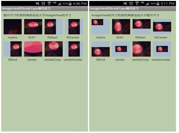 在布局文件中我們定義了每個ImageView的寬高都是固定的300像素,這個尺寸遠小於或者是遠大於測試的圖片尺寸,另外為了便於觀察效果我給每個ImageView的背景都設置了顏色,接著運行大圖和小圖的測試結果,效果如下: