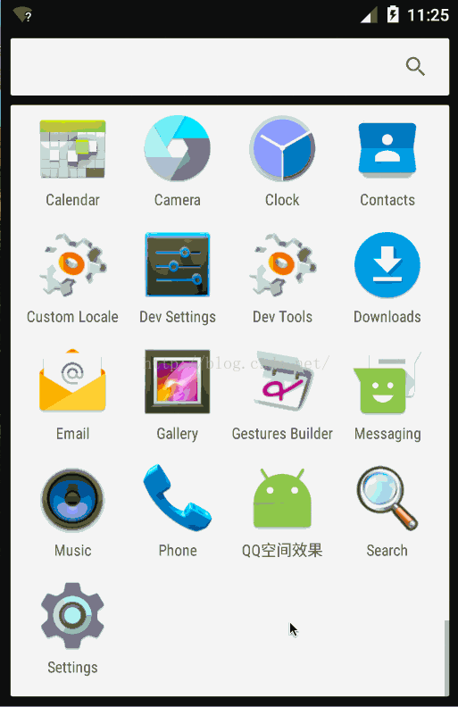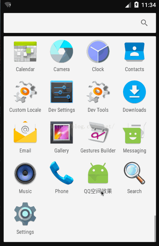 通過觀察QQ空間的運行效果,發現當往上滾動時菜單欄會隨著滾動距離的增大其透明度組件增大直到完全不透明,反之逐漸透明。當滾動到頂部後繼續下拉會出現拉升效果當松手之後出現阻尼回彈效果。於是就通過重寫ListView模仿了QQ空間的運行效果。