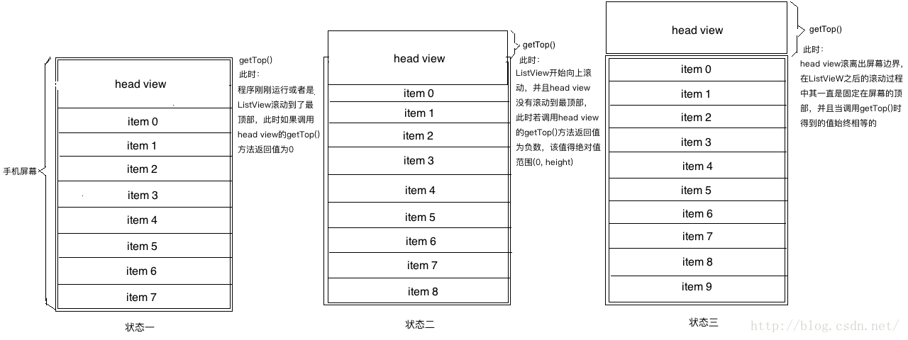 上圖大致畫了ListView含有HeaderView時的三個滾動狀態,狀態一可稱為初始狀態或者是恰好滾動到最頂部狀態,此時HeaderView的getTop()值為0;狀態二為ListView的滾動中狀態,此時HeaderView沒有完全滾動出ListView邊界,getTop()的返回值為負數且其絕對值范圍在0和HeaderView的高度之間;狀態三表示的是HeaderView完全滾動出了ListView邊界,若調用getTop()得到的返回值為負數且絕對值等於HeaderView的高度(此後可理解成HeaderView一直固定在ListView的頂部)。