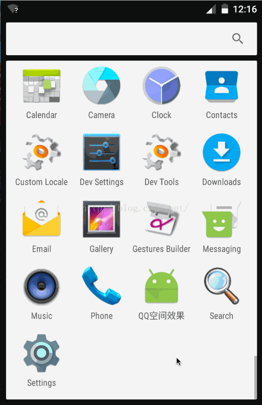看到運行效果好開心呀,(*^__^*) ……透明度漸變功能達到了我們的預期,接下來開始實現阻尼效果,阻尼效果就是當ListView滾動到了頂部此時若繼續下滑,ListView能夠繼續往下滾動一段距離當手指離開屏幕後ListView要恢復原位置。為了實現這個功能有的童靴可能會想到重寫有關事件傳遞的onXXXEvent()等方法,之後在MotionEvent為DOWN,MOVE,UP或者CANCEL條件下分別做邏輯判斷來實現阻尼效果,此方式可行,但是和今天我們的實現相比起來復雜了許多......