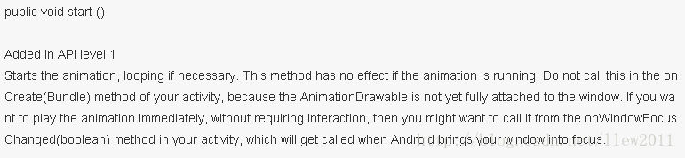 這時候,你一定會想,運行之後不論點擊不點擊按鈕(實際上你把按鈕點爛,圖片都不會轉滴,因為我把它注釋掉了,(*^__^*) 嘻嘻……)圖片都會旋轉,嗯,我們運行一下程序,結果你會發現圖片並沒有像我們想象中的那樣旋轉。咦?奇了怪了,圖片怎麼不旋轉呢?是不是哪寫錯了,於是從頭到尾檢查了一遍代碼,當確定了代碼沒有問題之後,你就郁悶了,估計會想是不是因為沒有刷新的緣由呀(我剛開始就是這樣想的,嗚嗚~~~~(>_<)~~~~ )?於是趕緊使用了View的刷新方法,把所有的都試了,圖片還是不能旋轉,你就更郁悶了,怎麼會這樣呢?是不是在onCreate方法中不能這樣調用animationDrawable.start()?於是又嘗試了把animationDrawable.start()方法放入到onResume()方法中,但結果圖片還是不旋轉,最後使用了最後一招又把該代碼放入到onWindowFocusChanged(boolean hasFocus)方法中,這樣一試,圖片終於旋轉了,呵呵,好開心呀,這時候你會很開心,因為以後使用的話直接在onWindowFocusChanged(boolean hasFocus)方法中調用animationDrawable的start()方法就行了,不再需要利用其它的事件來觸發圖片的旋轉了,緊接著你估計就會想了為什麼animationDrawable的start()方法非得放到這裡才會執行了呢?出於習慣你應該會想到去找官方文檔查看一下,找呀找呀找呀,終於找到了,官方文檔的說明截個圖如下:
