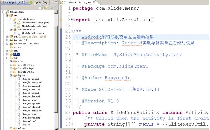 在程序中,我們需要導入android-support-v4.jar包。在SlideMenuUtil類中設置導航菜單項標簽,如下: