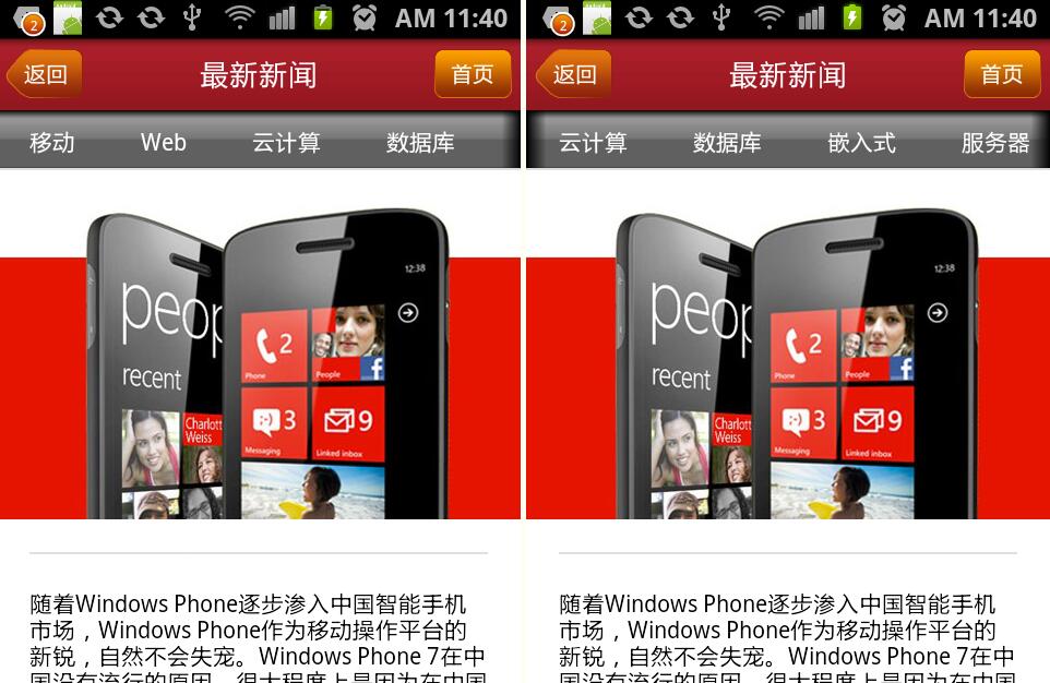 關於導航菜單,相信大家對它並不陌生,比如在新聞客戶端中就經常使用左右滑動菜單來顯示不同類別的新聞。網上也有關於這方面的一些示例,但是許多都是使用Tabhost來做的,實現了圖片平滑動畫效果,但沒有實現菜單左右滑動的效果。我們先來看下本示例的效果圖: