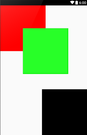在代碼裡,有三個View,而在運行結果上只能看到兩個View,一個黑色和一個綠色。這是因為紅色的View被黑色的View蓋住了。