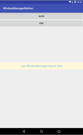 <?xml version="1.0" encoding="utf-8"?> <LinearLayout xmlns:android="http://schemas.android.com/apk/res/android" android:layout_width="match_parent" android:layout_height="wrap_content" android:gravity="center" android:id="@+id/root" android:orientation="vertical"> <TextView android:layout_width="match_parent" android:layout_height="50dp" android:text="I am WindowManager layout view" android:textSize="20sp" android:gravity="center" android:layout_gravity="center" android:background="#FFF8DC" android:textColor="#7AC5CD"/> </LinearLayout>